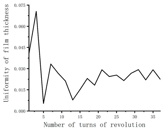 Figure 10. Within 20 revolutions, the uniformity of the film thickness changes drastically because the path traversed by a point changes constantly with the number of revolutions. After more than 20 revolutions, the uniformity of the film thickness stabilizes. Thus, it is necessary to determine the number of revolutions according to the film thickness and deposition rate when measuring the uniformity.