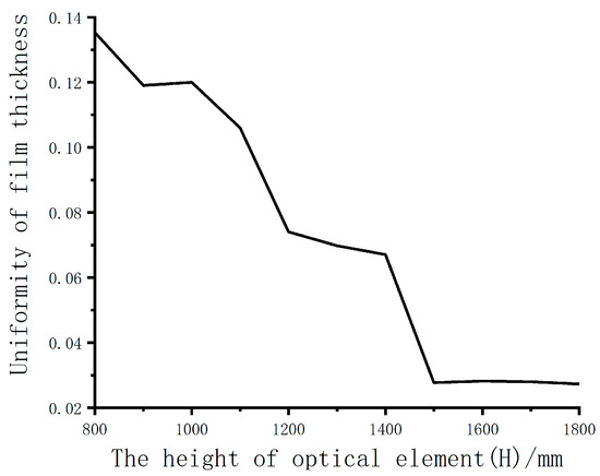 Figure 11 that the uniformity of the film thickness decreases gradually as the height of the optical element increases from 800–1500 mm. This also means that the difference in film thickness decreases from the center of the surface to its edge. However, after exceeding a height of 1500 mm, the uniformity of the film thickness no longer changes significantly.
