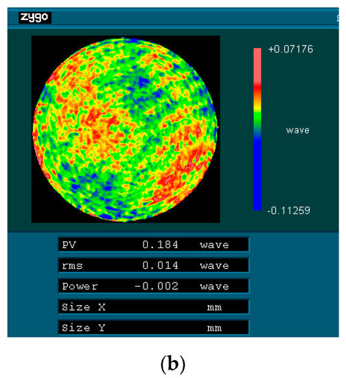 Figure 16a,b shows the interference diagrams of the surface before and after the application of the thin film coating, respectively. It is observed that there is almost no variation in the surface profile accuracy, which means that the nonuniformity of the film thickness is controlled with high precision.