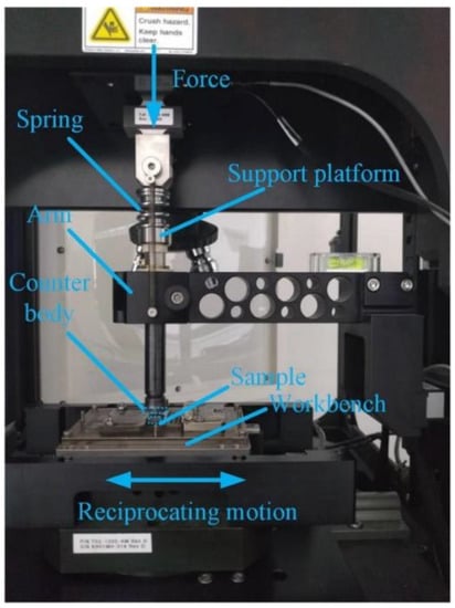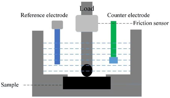 The friction and wear tester (RTEC, MFT-50, San Jose, CA, USA) was used to perform dry friction and wear tests on the coating. The test parameters were shown in Table 4. A white light interferometer was used to measure the wear volume and wear depth of the coating after dry friction and wear. Figure 2 shows the friction and wear tester. Corrosion wear requires simultaneous measurement of the electrochemical corrosion and tribology behavior of the coating. Corrosion wear equipment was shown in Figure 3. In the corrosion and friction test, the sample was used as the working electrode, saturated KCl was used as a reference electrode, and a platinum electrode was used as a counter electrode. The test parameters were shown in Table 5. By the white light interferometer, the wear rate and wear depth of the coating after corrosion friction and wear were measured. In the friction and wear experiment, the material of the grinding ball was GCr15, and the composition of GCr15 was shown in Table 6.
