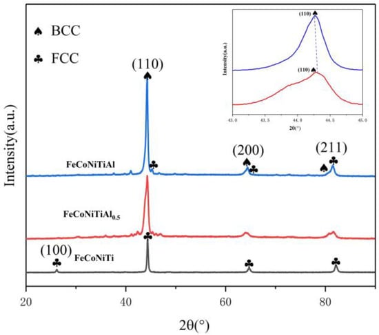Figure 4 shows the XRD pattern of FeCoNiTiAlx high-entropy alloy coatings prepared by laser cladding. The results show that HEA coating is mainly composed of a solid solution with a simple structure. The main phase of Al0 coating is the FCC phase. With the addition of the Al element, the phase structure of the Al0.5 coating has changed a lot, mainly composed of BCC crystal structures. When Al = 1, the phase composition of Al1 coating is similar to Al0.5·coating. It can be seen from the enlarged image the BCC diffraction peak is slightly shifted to the left. The reason is that the atomic radius of the Al element is larger, and the solid solution of the Al element will cause lattice distortion and expansion, and the lattice constant will increase, so the diffraction peak is slightly shifted to the left.