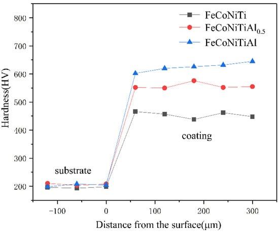 Figure 7 shows the microhardness distribution curve of the FeCoNiTiAlx high-entropy alloy coating section. It can be seen that the hardness distribution curve is in a stepped shape, and the curve is divided into three parts, corresponding to the cladding zone, heat-affected zone and substrate. From the surface cladding layer to the substrate, the hardness distribution shows a decreasing trend, and the decreasing interval is concentrated in the heat-affected zone. It can be seen from the figure that the hardness of the high-entropy alloy coating is significantly higher than that of the substrate. The highest average hardness of the Al1 coating (623 HV) is approximately 3.1 times the average hardness of the substrate (204 HV).