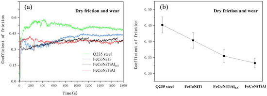 The friction coefficient curve (a) and value (b) of FeCoNiTiAlx coating and substrate under dry friction and wear.