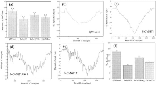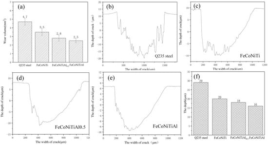 It can be seen from Figure 10a that the wear volume of the substrate reached the maximum, and it is 4.7 mm3. Due to the low hardness of the substrate, the surface of the substrate cannot withstand the continuous action of a tangential force. Under the action of normal load and constant reciprocating friction, a large amount of material falls off, which increases the wear volume and the depth of the wear scar (Figure 10b). In addition, the wear volume of the coating decreases with the increase of Al content, which is consistent with the friction coefficient of coating (Figure 9). When x = 0, the wear volume is 3.5 mm3. As the Al content increases, the wear volume of the coating continues to decrease, and the wear volume of the Al0.5 alloy coating drops to 2.8 mm3. When Al = 1, the wear volume reaches the minimum value of 2.5 mm3. At the same time, it can be seen from Figure 10f that with the addition of the Al element, the depth of the coating wear scar gradually decreases from 20 to 16 μm. Besides, the inner side of the coating wear scar gradually becomes smooth from Figure 10c–e. The addition of the Al element improves the hardness and wear resistance of the coating, so that the coating is not easily damaged when subjected to tangential and normal loads, thereby making the inside of the wear scar gradually smooth.