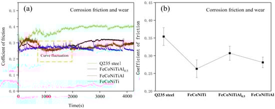 The friction coefficient curve (a) and value (b) of FeCoNiTiAlx coating and substrate under corrosion friction and wear.