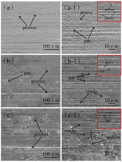 SEM images of the worn surface of FeCoNiTiAlx high-entropy alloy coating under corrosion friction and wear. (a) FeCoNiTi-500X; (b) FeCoNiTiAl0.5-500X; (c) FeCoNiTiAl-500X; (a-1) FeCoNiTi-2500X; (b-1) FeCoNiTiAl0.5-2500X; (c-1) FeCoNiTiAl-2500X.