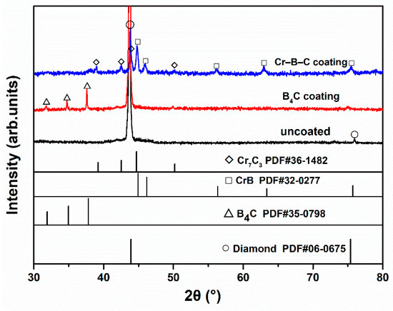 XRD patterns for uncoated diamond particles, diamond particles with B4C coating, Cr–B–C coating, respectively.