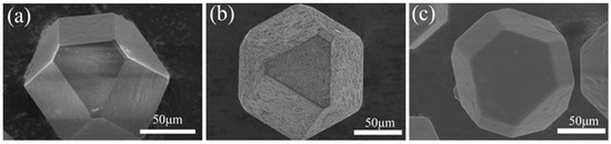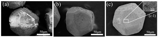 Figure 2 shows the SEM images for the diamond particles with different coatings. After a high temperature process, a complete coating coverage is obtained at the B4C-coated diamond and Cr–B–C-coated diamond, and no cracking or spalling is found on the diamond surface. As shown in Figure 2b, a large number of small particles are deposited on the surface of diamond due to the formation of B4C particles. As a contrast, the Cr–B–C-coated diamond (Figure 2c) shows a relative smoother surface without any obvious particles. In addition, B4C-coated diamond can still maintain polyhedron shape, but the shape of the Cr–B–C-coated diamond has changed from sharp corners to nearly spherical. This also indicates that the two-step synthesis method of Cr–B–C coatings continue to grow on the basis of the B4C coating, and the thickness of the coating is greater than that of B4C.