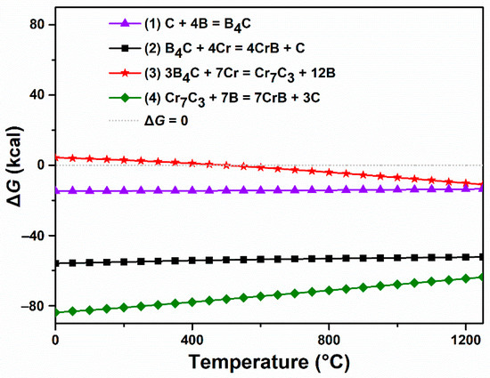 Effects of temperature on the Gibbs free energy (ΔG) of reactions (1)–(4) are shown in Figure 3. It is well known that a reaction can only occur when its ΔG is below zero, and a smaller ΔG gives rise to an easy reaction. The Equation (1) showed that B4C was formed by diamond and Cr since the ΔG < 0 at 1200 °C. At the heating process of the Cr–B–C system, the inorganic salt (NaCl and KCl) added in the raw mixture acted as a catalyst that cannot participate in the reaction actually, and chromium was immediately reacted with B4C to form CrB (as shown in Equation (2), the ΔG < −50 kcal from 0–900 °C) and Cr7C3 (as shown in Equation (3), the ΔG < 0 when temperature > 500 °C). In the meantime, the formed Cr7C3 transformed to CrB continuously as the temperature rose further to 900 °C (as shown in Equation (4), the ΔG < −60 kcal). Finally, when the mixture maintained 900 °C for 2 h, the formed CrB was the end product, with a small amount of Cr7C3 that had not yet reacted completely, which agreed well with the results of the XRD patterns (Figure 1).