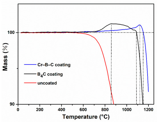 Oxidation resistance of the uncoated, B4C-coated and Cr–B–C-coated diamond particles was determined by the TGA. As shown in Figure 4, for the uncoated diamond particles, the TGA curve displays an obvious protection failure while the heating temperature reaches 720 °C, indicating the oxidation resistance of the uncoated diamond can reach 720 °C. The TGA curve for the B4C-coated diamond displays a weight gain from 700 to 855 °C, and slowly decreases to 100% in weight until 1090 °C. The weight gain was attributed to the formation of B2O3, and the fast weight decrease due to the evaporation of B2O3 according to our previous research [11,16]. For the Cr–B–C-coated diamond particles, the TGA curve shows that the weight increases from 599 to 1118 °C, and then decreases directly to 100% mass at 1151 °C.