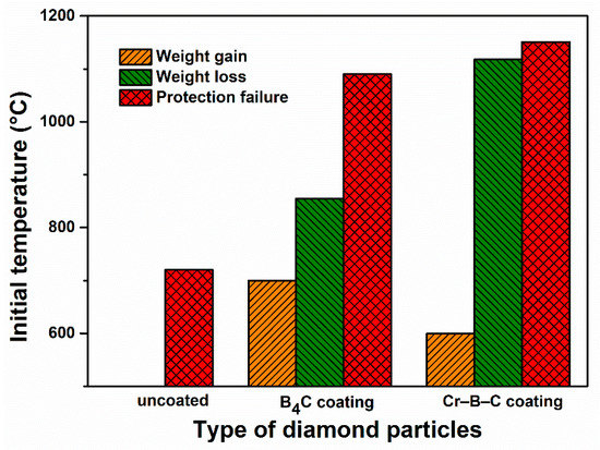 The inflection points of the curve in Figure 4 are made into the data histogram as shown in Figure 5. From the initial temperature of weight gain, the Cr–B–C coating (599 °C) and B4C coating (700 °C) are both lower than the oxidation temperature of diamond in air (720 °C), indicating that the coatings can play a protective role before diamond oxidation. From the initial temperature of weight loss, the Cr–B–C coating (1118 °C) and the B4C coating (855 °C) are much higher than that of the uncoated diamond (720 °C) as well, indicating that both Cr–B–C coating and B4C coating had good protective effect, and the Cr–B–C coating has better effect on delaying the oxidation of diamond than the B4C coating. From the initial temperature of protection failure, when the diamond mass loss is reduced to 100%, Cr–B–C coating (1151 °C) is better for maintaining the quality of diamond than B4C coating (1090 °C). In summary, the Cr–B–C coating exhibits the best protection of diamond particles from oxidation in this research.