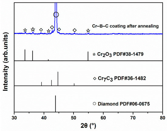 The Cr–B–C-coated diamond particles after annealing at 1151 °C with a heating rate of 5 °C/min in air, were observed of four peaks located at 33.68°, 36.32°, 41.18°, 54.88° which corresponded to Cr2O3 (JCPDF#38-1479) and other four peaks located at 39.19°, 42.54°, 44.16° and 50.19° can be corresponded to Cr7C3 (as shown in Figure 6). Therefore, the Cr–B–C coatings after annealing at 1151 °C were composed of Cr2O3 and part of Cr7C3 that has not been oxidized.