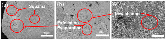 In order to visually observe the Cr–B–C coating after oxidation in Figure 7c, the sample was enlarged to obtain the SEM images shown in Figure 8a–c. It can be seen from Figure 8 that the crystal form and angular region of the diamond maintained very well. On the surface of the Cr–B–C coating, large squama structures appeared, which was related to the oxidation of coating components at high temperature. When the oxidation product on the diamond surface evaporated and exfoliated, the original fluid B2O3 showed holes and voids, bringing new oxygen flow channels to the diamond which damaged the protection of the coating.