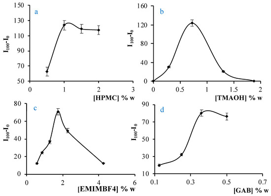 Optimization of reagent concentration for sensing membrane containing IL: (a) HPMC; (b) TMAOH; (c) EMIMBF4; (d) GAB.