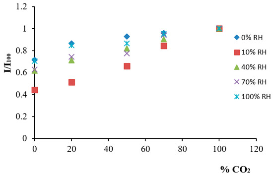 It is well known that temperature and humidity have a considerable effect on the sensitivity of luminescent sensors [41], particularly at high values of both parameters. The dependence of the relative humidity of the sensing membrane at room temperature (22 ± 1 °C) was studied, obtaining the calibration function at relative humidities between 10% and 100% and observing a reduction in sensitivity with as the % RH increases (Figure 2). The experiments assays were carried out at a constant room temperature, 22 ± 1 °C, in all cases, although there is a known decrease in sensitivity as the temperature increases [42]. This fact occurs owing to the opposite dependence of CO2 solubility in the pH indicator membrane on the temperature [43].