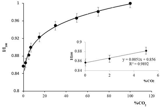 where the values of the coefficients are as follows: a = 0.72 ± 0.05; b = 0.12 ± 0.05; c = 0.17 ± 0.05 and r2 = 0.9961. The signal increases exponentially until it reaches 100% CO2. For that reason, the detection limit, LOD, was calculated from the raw exponential experimental data by using the first three points (Figure 3 insert), which can be adjusted to a straight line, I/I100 = 0.0051[% CO2] + 0.856; R2 = 0.989 [49], using (LOD = t0N − 3s0), where t0N is the blank or average value in the absence of CO2 and s0 is the critical level or standard deviation of the blank, which was calculated from six replicate measurements. The limit of quantification (LOQ) of the instrumental procedure was obtained from the linear Stern-Volmer calibration function by using LOQ = t0N + 10s0. The LOD found with this approach was 0.26% CO2 and the LOQ was 1.64% CO2.