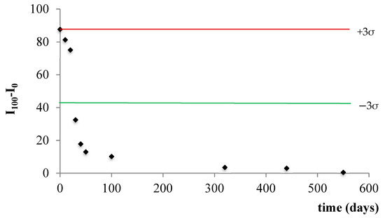 The stability of the membrane was studied by measuring the I100-I0 value for 10 months from a set of membranes using a Shewhart control chart. We defined the lifetime of the sensor (T1) as that in which the sensor output signal remains within the control line on the Shewhart chart for one constant concentration of CO2 gas concentration. The lifetime of the sensing membrane (T2) is the time during which the membrane responds to CO2, even though it is necessary to recalibrate it. Figure 5 shows the control chart for the sensing membrane containing IL. The sensor signal remains within the established control limits up to 20 days, after which the sensor responds up to 300 days, as it is possible to recalibrate the signal within this period. After this period, the sensor must be replaced because no response is obtained.
