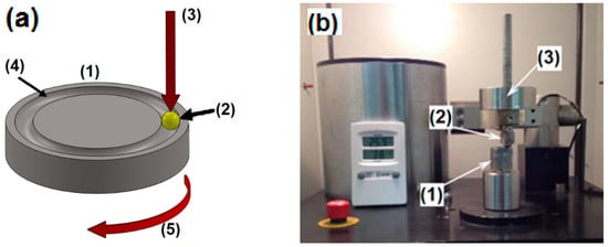 (a) scheme and (b) equipment for ball-on-disk testing, (1) sample, (2) ball, (3) load, (4) wear path on sample, and (5) rotation direction of sample.