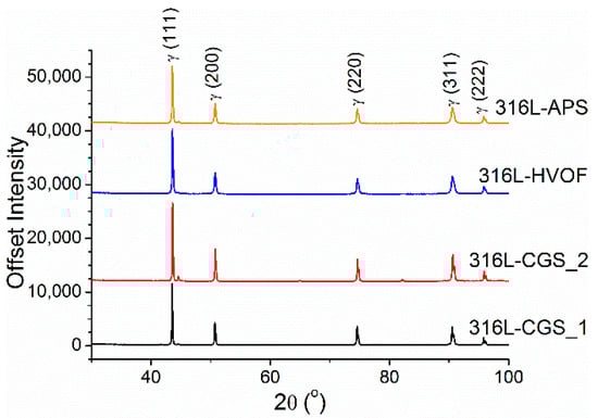 In order to corroborate the chemical composition and crystallographic structure of the powders used in this study, the content of alloying elements and the identification of phases in the 316L powders was carried out by ICP and XRD, respectively. The composition of the powders is shown in Table 2, which were in agreement with the 316L reference, as expected. Only a exception was observed for 316L-APS powder, the Ni and Mo amounts closely out of range. The XRD diffractograms corresponding to all the 316L powders are shown in Figure 3 and their phase analysis indicates the presence of one only phase, austenite γ (reference code: 00-023-0298), in all of the feedstock powders.