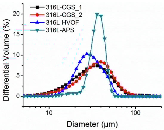 For the tests carried out in this work, four different 316L commercial powders were used, two powders are specially designed for CGS technology and prepared by water atomization: 316L-CGS_1 (Ref: 316L from Daye, Shijiazhuang, China) and 316L-CGS_2 (Ref: SS316L from Plasma Giken, Saitama, Japan). While the other two are specific powders for conventional thermal spraying techniques and obtained by gas atomization: 316L-HVOF (Ref: DiammalloyTM 1003 from Oerlikon, Westbury, NY, USA) and 316L-APS (Ref: 316L from Sandvik, Neath, UK). In Table 1 the powders properties and characteristics informed by the manufacturers are summarized.