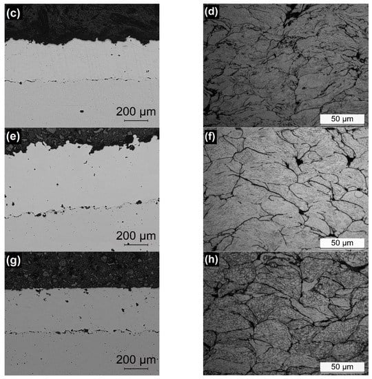 OM of cross-sectional image of the CGS coatings obtained at 50× as polished and 500× as etched. Powders: (a,b) 316L-CGS_1, (c,d) 316L-CGS_2, (e,f) 316L-HVOF, and (g,h) 316L-APS.