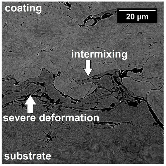 The OM cross section images recorded for the CGS coatings deposited in this study are shown in Figure 5a–h. In these images, it can be observed that all the coatings showed the densified and typical structure of CGS coatings, with the deformed powder particles forming the lamellae/splats structure, clearly seen in the etched samples. The etching also revealed the severe grain deformation in the periphery of the particles. In addition, the Figure 6 presents an example of interface substrate/coating revealing the severe deformation of the carbon steel substrate and the intermixing between the coating and substrate materials, which are anchoring mechanisms of the CGS coatings [21,22,23]. The coating/substrate interfaces also did not present inclusions of alumina from sandblasting preparation process nor delamination.