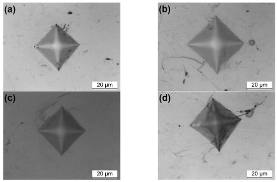 Marks for hardness measurements of the coatings. (a) 316L-CGS_1, (b) 316L-CGS_2, (c) 316L-HVOF, and (d) 316L-APS.