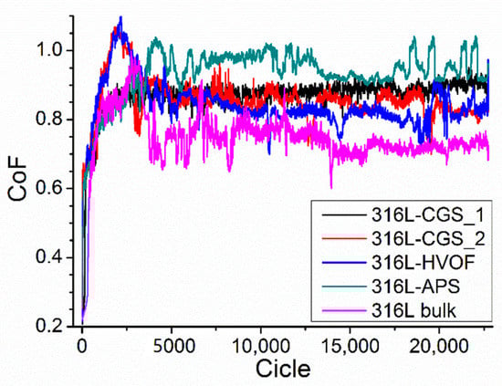 The coefficient of friction (CoF) between a WC-Co counterpart and the 316L CGS coatings was measured by means of ball-on-disk experiments. Figure 9 presents the evolution of the CoF obtained during the experiment for all the coatings and a 316L bulk material. The CoF values calculated at the end of the experiment, when the system reached a stationary behavior are included in Table 6. Similar CoF were measured for all the coatings prepared by CGS, independently of the powder used for their deposition. The 316L bulk CoF, 0.746, is close to results seen in literature with the same testing load, 0.7 [57] and 0.8 [58]; however, the CoF of all the coatings were higher than the bulk, with the highest CoF for the 316L-APS, 0.934.