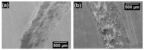 The wear mechanism of the coating and bulk samples was partially abrasive type, with typical furrows in the direction of the ball relative movement, indicated as area (1) in Figure 10b. Some debris act as a third body during the sliding wear and these materials are extensively deformed and adhered to the worn surface of wear track, presented as area (2) in Figure 10b, which refers to adhesive type wear mechanism. The wear tracks on the coatings samples are presented in Figure 11. The ratio of abrasive/adhesive type wear was higher for the bulk than for the coatings, prevailing the abrasive mode. The EDS mapping of the coating and bulk samples revealed the oxidation of the debris adhered to the wear track, as exemplified by the 316L bulk analysis in Figure 10c–f. The sample 316L-APS had the highest friction wear rate, 2.23 × 10−4 mm3·N−1·m−1, while the 316L-CGS_2 had the lowest one, 1.25 × 10−4·mm3·N−1·m−1; however, this discrepancy of values is too small and the materials presented very similar friction performance.