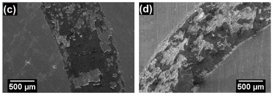 SEM of the coatings ball on disk testing track. 50×. (a) 316L-CGS_1, (b) 316L-CGS_2, (c) 316L-HVOF, and (d) 316L-APS.
