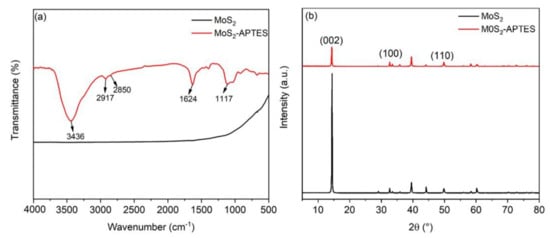 (a) FT-IR spectra and (b) XRD patterns of MoS2, and MoS2-APTES.