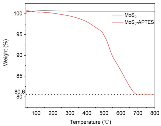 The thermal stability of MoS2 and modified MoS2 was studied via TGA from 40 °C to 800 °C under N2 atmosphere. The TGA curves of the initial MoS2 and MoS2-APTES hybrids are exhibited in Figure 5. There is no obvious loss of weight during the thermal decomposition procedure of the original MoS2, manifesting its excellent thermally stability in a nitrogen atmosphere [24]. For MoS2-APTES, an enormous amount of decline in weight is attributed to the thermal decomposition of APTES on the surface of MoS2 and the evaporation of the residual water. At the same time, the TGA curves also prove that the amount of APTES in MoS2-APTES hybrids is about 19.4 wt.%.