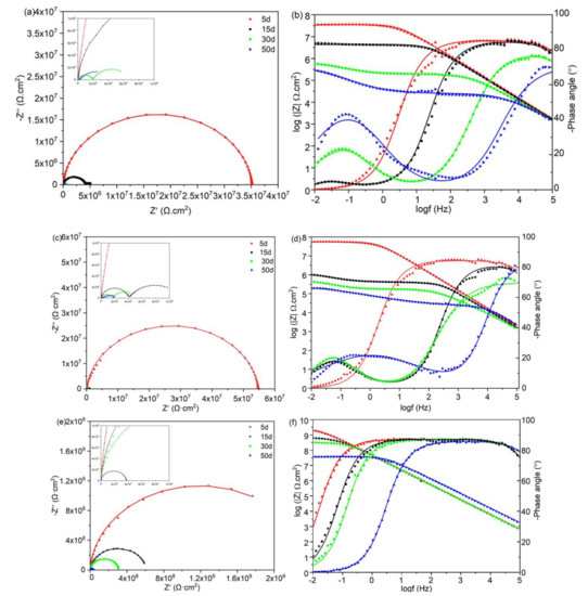 EIS was employed to investigate the corrosion resistance performance of the waterborne epoxy coatings at the steady open circuit potentials after an increasing amount of immersion time. The achieved studying data were drawn as Nyquist and Bode diagrams through the immersion time for 5, 15, 30, and 50 days. From Figure 7a,c,e, it could be obviously spotted that with the extending immersion time, the impedance diameters of all the epoxy coatings expose a decline in the Nyquist plots, which means that the anticorrosion property of the coatings is dwindling. As shown in Figure 7a,b, the pure WEP coating only has a semi-arc and one time constant when the immersion time is at 5 days. However, as the time extends to 15 days, the second time constant and two arcs appear, demonstrating that pure WEP coating cannot maintain the decent ability of corrosion resistance for N80 steel. Even though the arcs diameter of the MoS2/WEP coating (Figure 7b) was much larger than that of the neat WEP coating at the original immersion in 3.5 wt.% NaCl solution (5 days), it dramatically plunges and the second time constant appears similarly when the immersion time merely increases to 15 days. In this situation, the bad dispersibility and compatibility of MoS2 in the WEP coating are the main factors. In obvious contrast to the neat WEP and MoS2/WEP, MoS2-APTES/WEP coating (Figure 7e), exhibits the largest impedance arcs after the same immersion time and has only one semi-arcs. Additionally, this compound coating keeps one time constant from 5 to 50 days immersion, which proves that MoS2-APTES coating possesses an outstanding barrier ability and an excellent anticorrosion property.