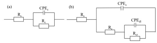 The corrosion protection ability of the neat WEP, MoS2/WEP, MoS2-APTES/WEP was investigated by electrochemical impedance spectra (EIS) measurements which were from the CorrTest CS350 in 3.5 wt.% NaCl solution. Three traditional electrode systems including a working electrode (specimen coatings), reference electrode (saturated calomel electrode) and counter electrode (foil electrode) were applied in the measurement process. During the EIS test, the parameter of the frequency range was 10−2~105 Hz and the open circuit potential (OCP) always remains stable. In addition, the test data were fitted and evaluated by the ZsimpWin software. Additionally, the potentiodynamic polarization test was employed to further study the anticorrosive performance of the composite coating, which was conducted with a scan rate of 1 mV·s−1 from −200 mV (the cathodic direction) to +200 mV the anodic (direction).