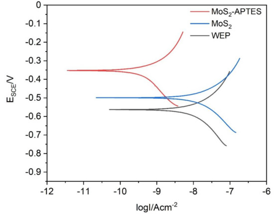 Potentiodynamic polarization test of the coatings was performed after immersing in 3.5 wt.% aqueous NaCl solution for 50 days and polarization diagrams were displayed in Figure 9. Generally speaking, if the protection coating has a higher corrosion potential (Ecorr) and a lower corrosion current density (icorr), it will be endowed with stronger anticorrosion property [39]. According to Figure 9, it can be apparently spotted that the MoS2-APTES/WEP coating shows more positive Ecorr in contrast to MoS2/WEP and a neat WEP coating. In addition, the icorr of MoS2-APTES/WEP coating is transparently lower than the others. The obtained results can be clarified via two explanations. One is that well distributed MoS2 modified by APTES could prolong the corrosive media’s routes to the substrate; another is that amine groups from APTES could lessen flaws in the WEP coating by increasing the crosslink density of the coating. Thus, MoS2-APTES/WEP coating displays the highest anticorrosion result among the three types of coatings.