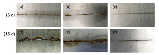 A salt spray test was employed to further evaluate the long-term anticorrosion property of coatings. The images of coatings, with 4 cm scratches on their surfaces after being made, put in salt spray of 5 wt.% NaCl for 5 and 15 days are displayed in Figure 10. For a neat WEP coating (Figure 10a,d), there are clear bubbles and corrosion products in the vicinity of the scratch after the exposure time reaches 5 days, exposing the inferior anticorrosion property of the neat waterborne epoxy coating. As the time extends to 15 days, the corrosion phenomenon increases heavily and much more corrosion products can be easily observed around the scratch, which are caused by more corrosion medium, which reaches the metal surface through coating flaws. After the addition of MoS2 (Figure 10b,e), the MoS2/WEP coating exhibits a similar corrosion protection result to the neat WEP coating during the salt spray test, because the bad dispersion of MoS2 in WEP and could not act as an effective barrier for the corrosive medium. In contrast to the neat WEP coating and MoS2/WEP coating, there are less corrosion products on the surface of MoS2-APTES/WEP composite coating (Figure 10c,f) even after 15 days of exposure time. The obtained results above prove that the MoS2-APTES/WEP coating has superior and long-term corrosion protection because of the physical barrier of MoS2-APTES.