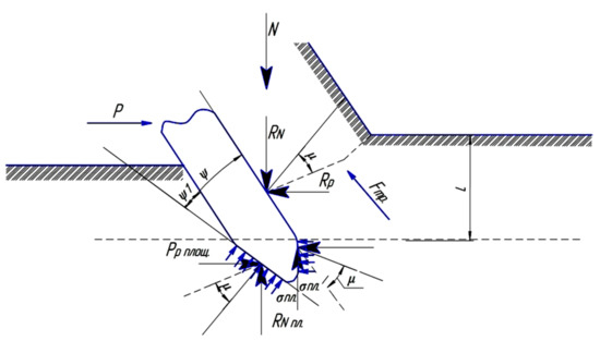 , —the angle of penetration of the tooth surface and the angle of deviation of the design surface; Ffr—ground friction forces; σa—the average pressure on the contact area of the tooth wall; RNa—the reaction of forces from the ground to the worn tooth surface; μ—the angle of friction of the worn cutting edge of the tooth; Ppf.—pressure on the wear area.