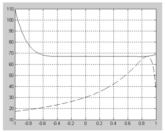 The result of the task solution taking into account Equations (30) and (27) prescribing the minimum value of half-width of the cutting edge of the transverse profile of the earthmoving machine operating device is shown in the graph curve (