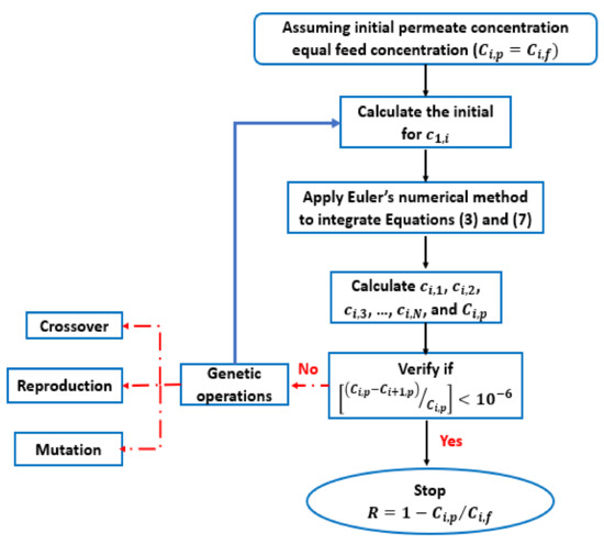 - From the estimated ci,N* value, and applying Equation (10), the permeate concentration Ci,p is calculated.