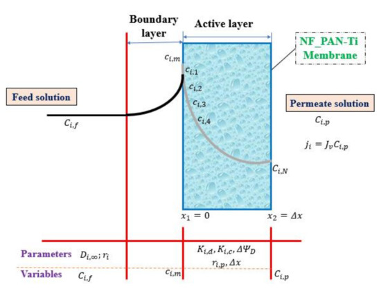 From Equation (7), the potential gradient was calculated, then it was substituted into Equation (22) for a new concentration of ion (i) within the active layer of NF membrane estimation. Then, the typical step-size is equal to the ratio of membrane thickness ( by the number n of nodes, in this work n = 100: