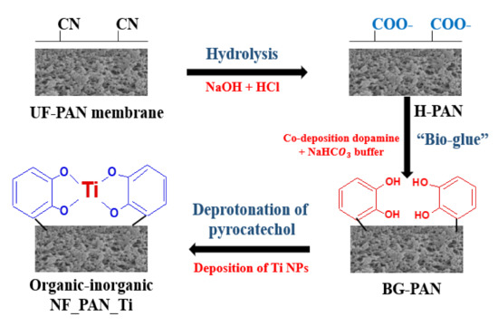 A flat sheet (1 m × 1 m) of UF membrane of polyacrylonitrile (PAN) possessing a molecular weight cut-off of 100kDa was a commercial product that was bought from Shanghai Corun membrane technology Co. Ltd (in Shanghai, China). Titanium sulfate hydrate and various salts, including (Na2 SO4, MgSO4, NaCl, CaCl2) and MgCl2, were all ordered from Aladdin (Shanghai, China). Hydrochloric acid solution (12 mol·L−1), sodium hydroxide (NaOH), and butyl alcohol (C4H9OH) were obtained from Sino Pharm Chemical Reagent Co. (in Harbin, China). Deionized (DI) water, dopamine hydrochloride 98%, HCl (HO)2C6H3CH2CH2NH2), and sodium bicarbonate buffer (NaHCO3) solution were all purchased from Aladdin (Shanghai, China).