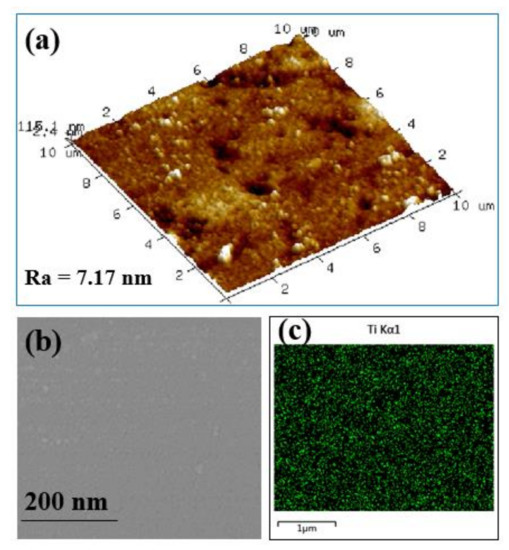 Novel organic-inorganic NF_PAN_Ti membrane (a) atomic force microscopy (AFM) image, (b) FESEM (field emission scanning electron microscopy), and (c) energy spectra of Ti element.