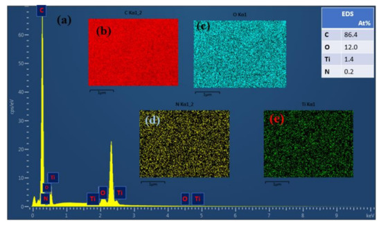 To provide more insights into the arrangement or potential function of the Ti nanoparticles (NPs) layer that took form on the PAN substrate, the energy dispersive spectrometer (EDS) was used as reinforcement of the field emission scanning electron microscopy (FESEM). In Figure 5e, the results of the energy spectrum analysis of the NF_PAN_Ti membrane are reported. The EDS reported four different elements (C), (O), (N), and (Ti) due to their unique X-ray signals. The elements , , , and are not distributed unevenly on the surface of the NF_PAN_Ti membrane as depicted in Figure 5b–e, respectively. Thus, it is possible to characterize and modify the materials at the atomic scale, providing unparalleled insight into the behavior of nanomaterials and particles, since each atomic position can be clearly distinguished by its unambiguous chemical signal (Figure 5a). The UF membrane used as a substrate is a polymeric membrane, so carbon is the most dominant element of the novel membrane and a very strong signal is observed at its position. The individual atomic columns are visible and distinct from the neighbors owing to their high contrast.