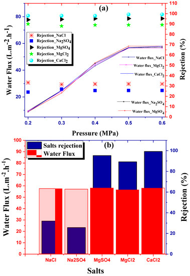 Figure 6a shows the water flux of NF_PAN_Ti membrane for different salt solutions obtained from at various applied transmembrane pressures of 0.2, 0.3, 0.4, 0.5, and 0.6 MPa. For all salts, plots of water flux vs. depicted perfect similarity for all solutions over the whole range of pressures investigated (0.2–0.6 MPa). The data lies on an almost similar plot to a very good approximation. This leads to an experimental confirmation that electrokinetic effects do not have great influence. For the NF_PAN_Ti membrane, the salts’ rejection increased slightly with the increase of pressure and stabilized around . This justifies the choice in the present study of optimum pressure at 0.6 MPa.
