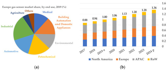 Selected statistical data of the global gas sensor market: (a) share of major sectors of the economy in the gas detector market for Europe; (b) global market for gas sensors broken down into regions—prediction; APAC—Asia Pacific, RoW—rest of the world, 2019 e—estimation, 2024 p—prediction [7,8].