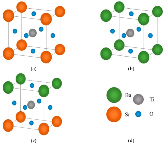 Non-polar structure at room temperature: (a) SrTiO3; (b) BaTiO3; (c) BaSrTiO3; (d) legend.