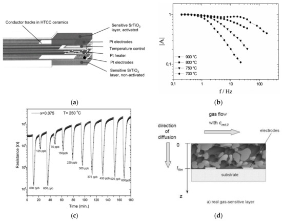 Examples of SrTiO3-based gas sensors: (a) Sketch of the sensor structure fabricated in the HTCC (high-temperature cofired ceramics) technology. Alumina tapes were used as the substrate with SrTiO3 doped with 1 at.% Ta as the gas-sensitive layer. Reprinted with permission from [89] Copyright 2021 Elsevier. (b) Magnitude |A| of a SrTi0.65Fe0.35O3 thick-film sensor with dependence on the frequency of the oxygen partial pressure. This experiment was carried out to investigate the kinetic behavior of SrTi0.65Fe0.35O3. At 900 °C, response times of 10 ms can be achieved. Reprinted with permission from [77] Copyright 2021 Elsevier. (c) shows the graph of SrTi0.925Fe0.075O3 as a function of ozone concentration and operating temperature (250 °C). The measurement cycles consisted of the ozone exposure time—2 min. The sample looks like a p-type semiconductor (the resistance of the sample decreases as oxidizing gases are absorbed). The diagram shows that the sample responds well to O3, from a concentration of 75 ppb O3. On the other hand, it is saturated at a concentration higher than 525 ppb of ozone. The saturation effect is due to the limited number of absorption sites. Reprinted with permission from [78] Copyright 2021 Elsevier. (d) A simplified one-dimensional approach to modeling screen-printed thick-film sensors. The sensor is modeled in two steps, macroscopic and microscopic. The macroscopic part describes the gas transport through a gas-sensitive porous film. In their work, the authors calculated the appropriate profile of bracing for the one-dimensional geometry shown in the figure.
