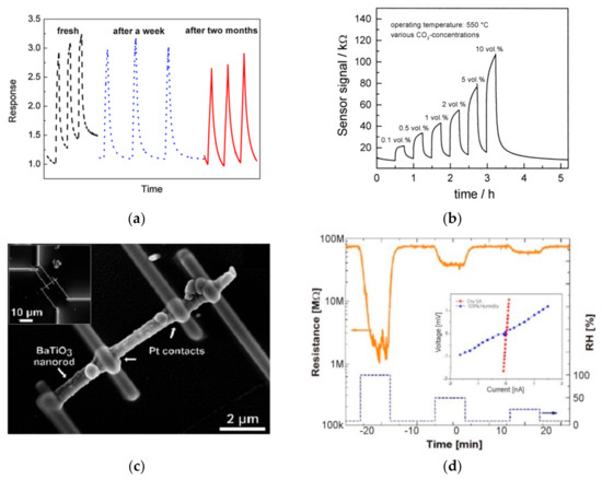Examples of BaTiO3 gas sensors: (a) Stability and repeatability of the Fe2O3-Ba0.99Ce0.01TiO3 sensor up to 400 ppb H2S at 150 °C. To check the repeatability and stability of the sensor, tests were carried out on a fresh sensor, after one week and two months. The sensor was tested by alternating cycles of 400 ppb H2S and N2 at 150 °C. The tested sensor showed quite good stability and repeatability. The longer operation of the sensor at the temperature of 150 °C resulted in the disappearance of the upward drift of the base resistance, which contributed to the improvement of the sensor′s performance. Reprinted with permission from [97] Copyright 2021 Elsevier. (b) Sensor response of the gas-sensing material based on BaTiO3 and CuO (1:1 molar ratio) with 10 wt. LaCl3 to various CO2 concentrations in the range 0.1–10 vol.%. at the operating temperature of 550 °C. Reprinted with permission from [93] Copyright 2021 Elsevier. (c) Detail of the BaTiO3 nanoprobe in contact with FIB nanolithography in a four-probe configuration. The insert in the upper left corner shows a low-magnification image of the same device. The platinum strips deposited with focused ion beam lithography (FIB) are clearly shown. The figure shows a prototype device created by integrating BaTiO3 nanorods using FIB nanolithography. The four-probe electrical measurements on the individual BaTiO3 nanorods on this sample showed resistivity values from 10 to 100 Ωcm, which is the typical value range for oxygen-deficient BaTiO3. (d) Scalable and reproducible response of a nanosensor sample made of BaTiO3 nanorods at room temperature to changes in air humidity (RH), with different responses to different levels of air humidity (100, 50 and 25%) in synthetic air. The inset shows the I–V curves obtained in dry and humid (100% RH) air.
