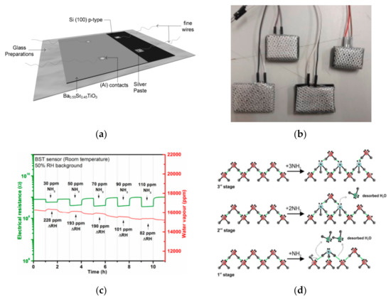 Examples of BaSrTiO3 gas sensors: (a) The Ba0.5Sr0.5TiO3 film doped with RuO2 model (the result of the copper wire installation) of a sensor for bad breath gas analysis. (b) The physical appearance of a Ba0.5Sr0.5TiO3 film doped with a RuO2 probe of a sensor for bad breath gas analysis. (c) The gas-sensing response of the BaSrTiO3 gas sensor under exposure to NH3 (30–110 ppm) at various RH concentrations. Reprinted with permission from [69] Copyright 2021 Elsevier. (d) Sketch of the gas reaction model of BST-based gas sensors to various NH3 concentrations. This model showed the impact of RH capillary condensation towards NH3 detection. Reprinted with permission from [69] Copyright 2021 Elsevier.