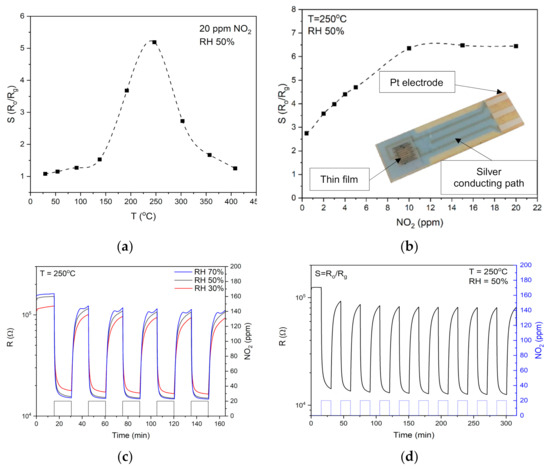 The gas-sensing characteristics obtained for a BST-Cu-based gas sensor: (a) the sensor response in the wide temperature range under exposure to 20 ppm of NO2 and 50% of RH; (b) the sensor response in the 0.4–20 ppm range at constant operating temperature and 50% of RH (inset: a photo of the fabricated gas sensor); (c) the resistance changes of the developed gas sensors at various RH concentrations and 20 ppm of NO2; and (d) the multitest of the gas sensor response measured at 250 °C, 50% RH and 20 ppm of NO2.